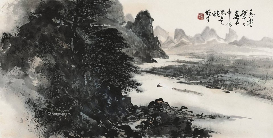 本品创作于1980年,为黎雄才松树写生稿,图中以宿墨写远山,表现雨后山峦苍润之气,近景写独松依山石生长,表现出松树的雄伟之势;整作笔触上清晰醒目,位置经营得当,在黎雄才的大量写生手稿和作品中,可以发现,松树的写生作品占据了很大的比重,在他的创作中,更是如此,几乎可说是“无松不成画”,更有相当多的作品是独松成画,这也是他独到的图式特征。