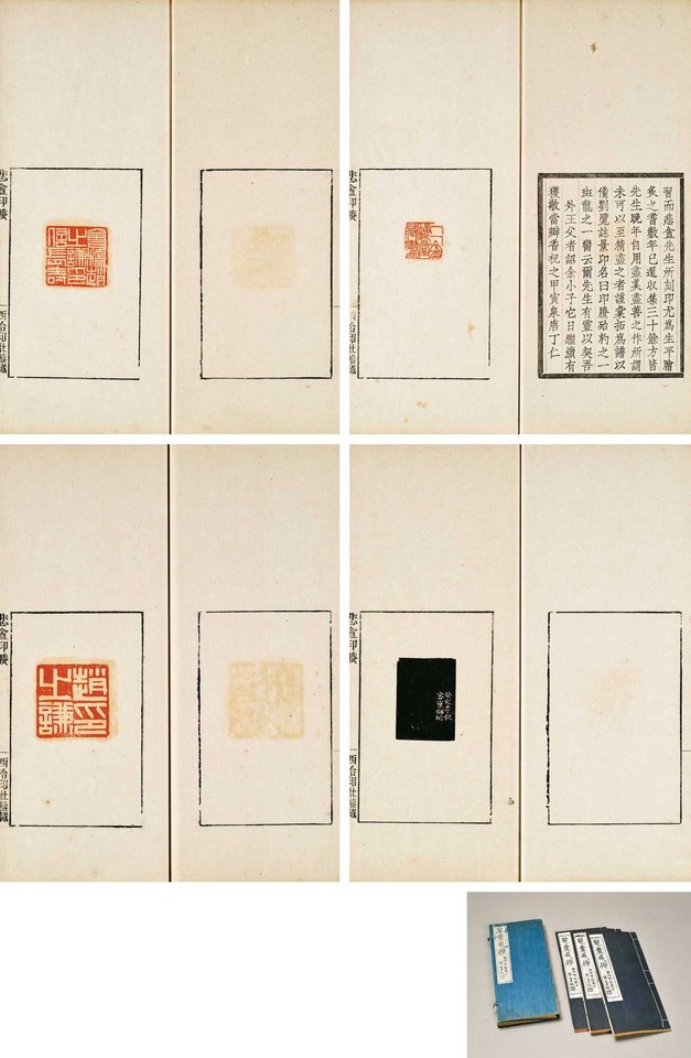 提要:此谱乃西泠印社辑社藏赵之谦篆刻而成,成谱于民国三年甲寅(1914)。谱前有丁仁序文一则,内页单线黑色版框,书口上署“悲盫印賸”,下署“西泠印社鉴藏”,每页钤一印,后续拓边款,所录诸印多为赵之谦自用及为何竞山、魏稼孙等好友所刻者。