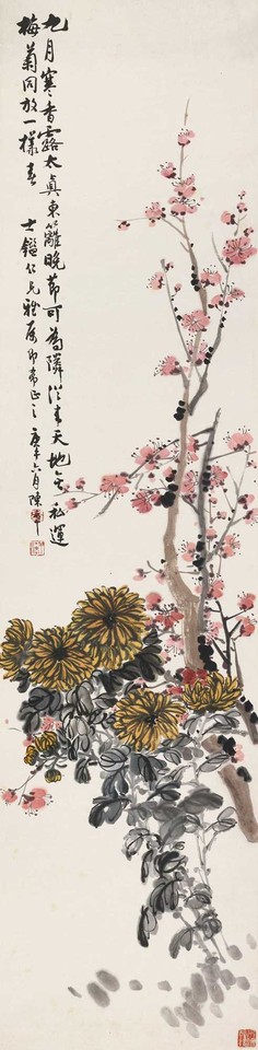 题 识:九月寒香露太真,东篱晚节可为邻。从来天地无私运,梅菊同放一样春。士鉴仁兄雅属,即希正之。庚午六月,陈年。