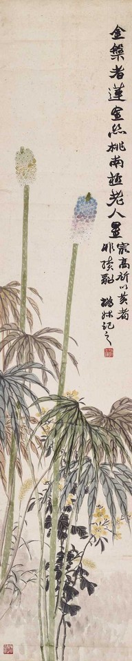 题 识:金盘者莲金丝桃,南极老人星最高。祈以黄耇非续貂。㧑叔记之。