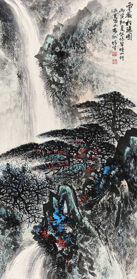 题识:云岩松瀑图。丙寅初夏偶忆昔时山行所见,写于广州,雄才。