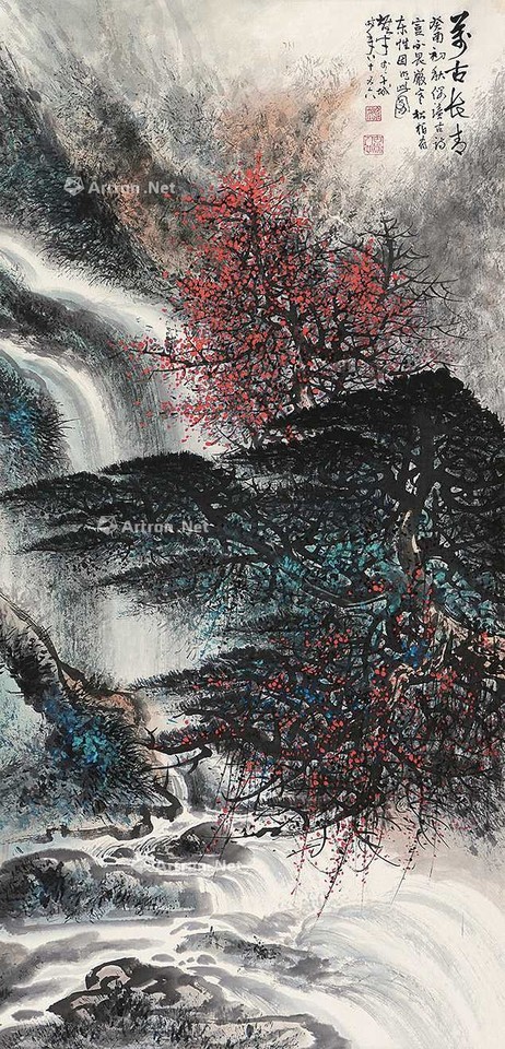 题识:万古长青,癸酉初秋偶读古诗,岂不畏严寒,松柏有本性,因作此图。雄才于羊城,时年八十又六。