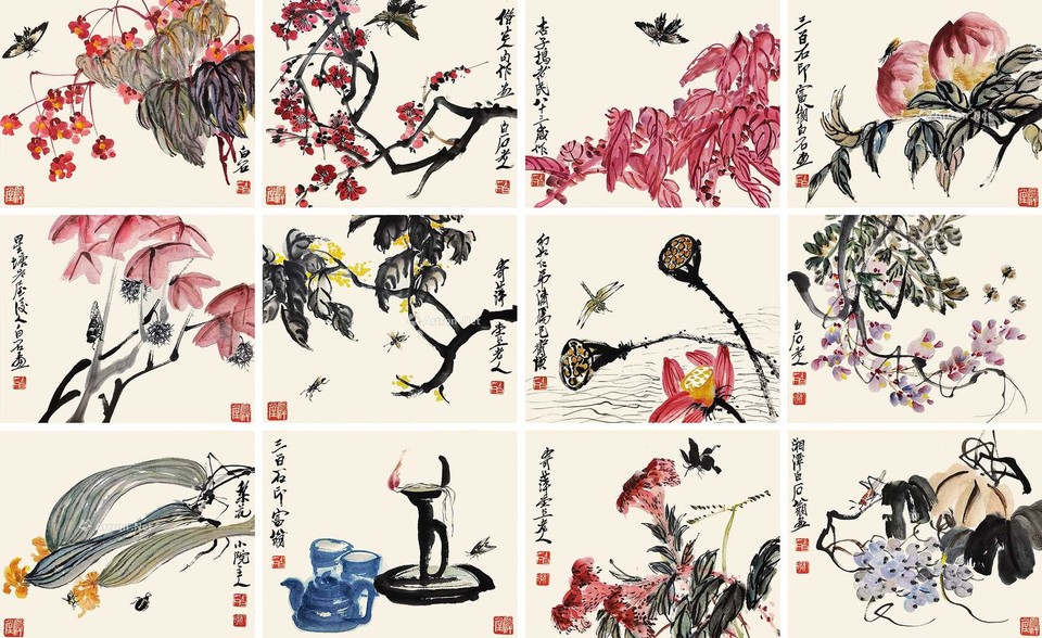 题识:1.白石。2.借古人句作画。白石老人。3.杏子坞老民,八十三岁作。4.三百石印富翁,白石画。5.星塘老屋后人,白石画。6.寄萍堂老人。7.幻如仁弟清属,兄齐璜。8.白石老人。9.梨花小院主人。10.三百石印富翁。11.寄萍堂老人。12.湘潭白石翁画。