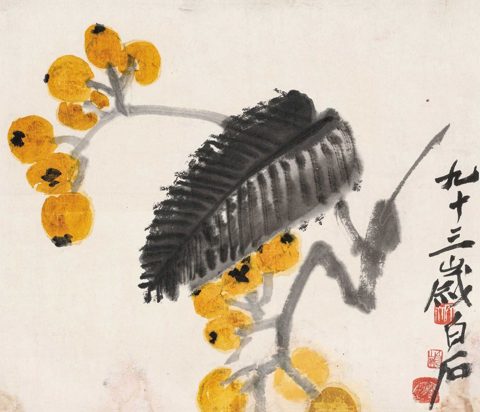 1909年,齐白石应友人郭葆生之邀赴广西钦州,途中在上海逗留了约两个月。这段时间里,他不仅游园观画、寻书访友,还品尝到了当地特有的白沙枇杷。这种枇杷香甜的汁液和滑嫩