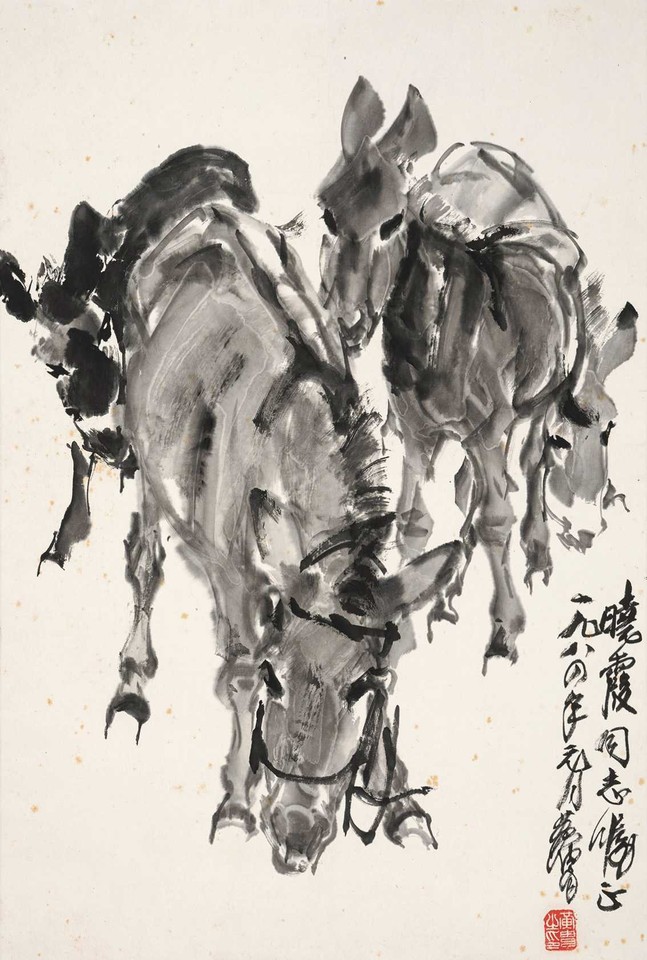 黄胄 1984年作 赠「晓霞」四驴图 立轴