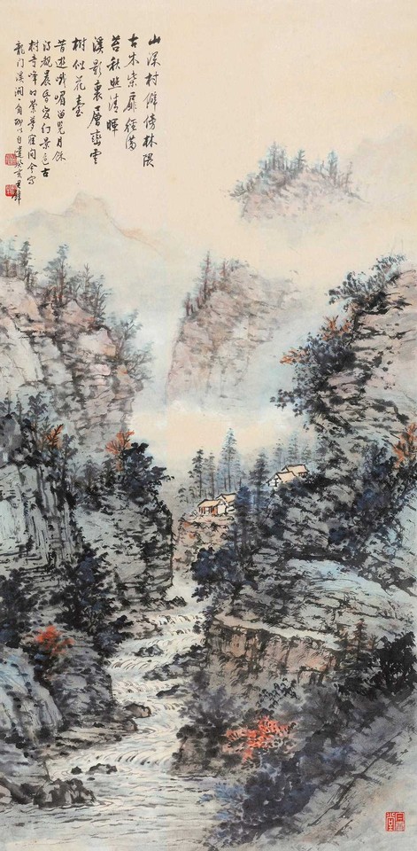 【题识】山深村僻傍林隈,古木紫扉径满苔。秋照清晖溪影里,层峦云树似花台。昔游峨嵋留览月余,得睹晨昏变幻,景色古树奇峰时萦梦寐间。今写龙门溪涧一角,聊以自遣。癸亥君璧。