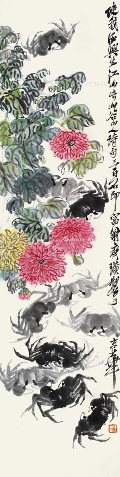 持蟹赏菊,历来是我国民俗生活的重要组成部分,也是千百年来传统文人的吟赏风流之举,并留下了无数的诗词佳篇。金秋时节饮酒、赏菊、食蟹大有风雅之意趣,文人画家一直以来都喜爱表现这个题材。吃螃蟹的喜好始终贯穿在白石老人关于螃蟹的画面里,他画了大量的墨蟹、熟蟹,用不同的画面表达吃螃蟹的雅好,