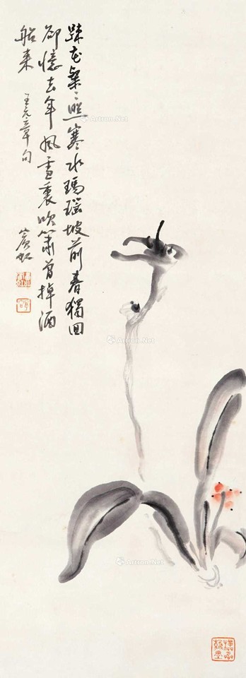 款识:疏花粲粲照寒水,玛瑙坡前春独回。却忆去年风雪里,吹箫曾棹酒船来。王元章句。宾虹。